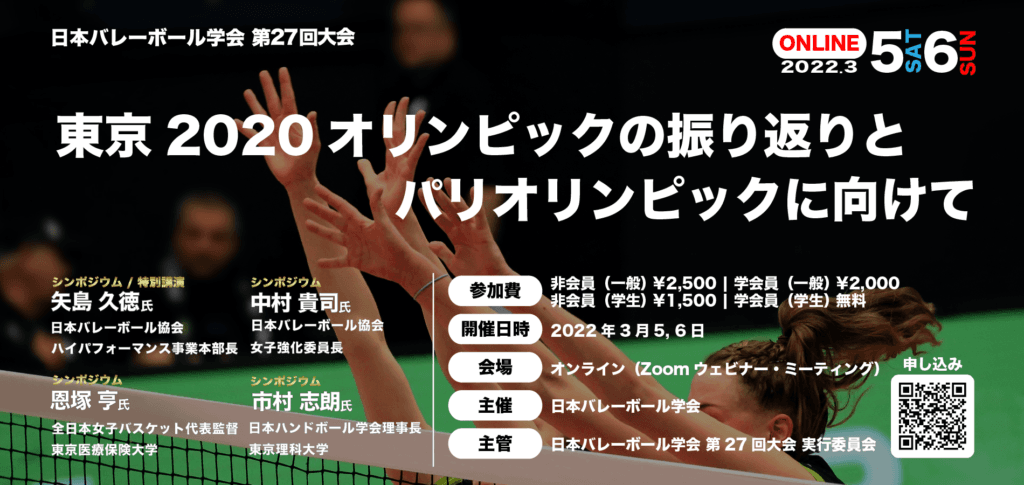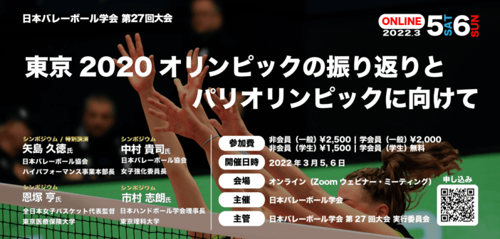 令和4年3月5日(土)と6日(日)に日本バレーボール学会 第27回大会がオンライン(Zoom)開催されます。