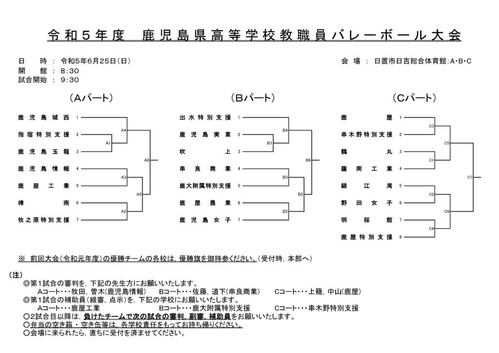 【組合せ】鹿児島県高等学校教職員バレーボール大会 0 By 上之園 広志 on 2023年6月13日 事務局からのお知らせ, 一般, 一般, 競技日程(県内)1主 催鹿児島県バレーボール協会2期 日令和5年6月25日(日)3会 場日置市日吉総合体育館【組合せ】R5教職員バレーボール大会(PDFファイル)大会要項(PDF)