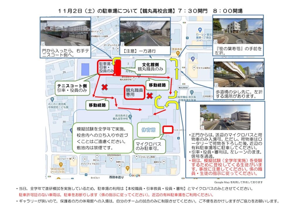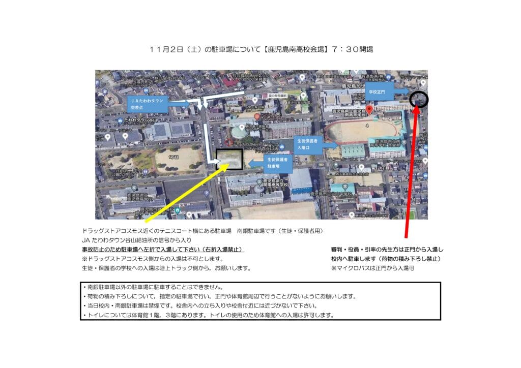 | 4 | 駐車場案内_鶴丸高校20241101(new)(PDFファイル) 模擬試験を実施しているため,一般の方の駐車はできません。 本校職員と顧問,大会役員,審判のみの利用となります。 お車でお越しの際は,近隣の有料駐車場をご利用ください。 画像をクリックすると拡大できます。 |