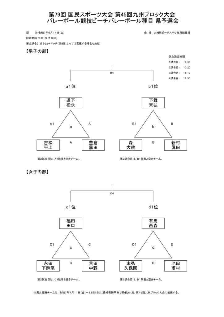 | 6.競技規則 | 2025年度(公財)日本バレーボール協会制定のビーチバレーボール競技規則による。 ※天候及び参加チーム数等により競技方法の変更あり。 |