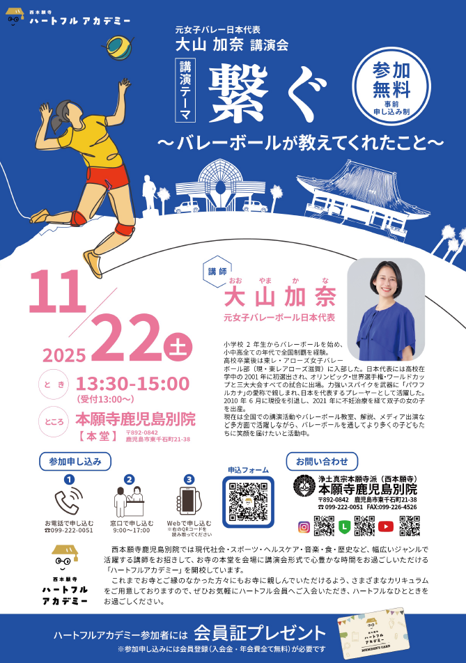 鹿児島・天文館地域の寺院にある本願寺鹿児島別院にて様々な分野の講師(学者・アスリート・専門職・僧侶等)をお招きし、学びを深めていただく取り組みとして実施させていただいております。